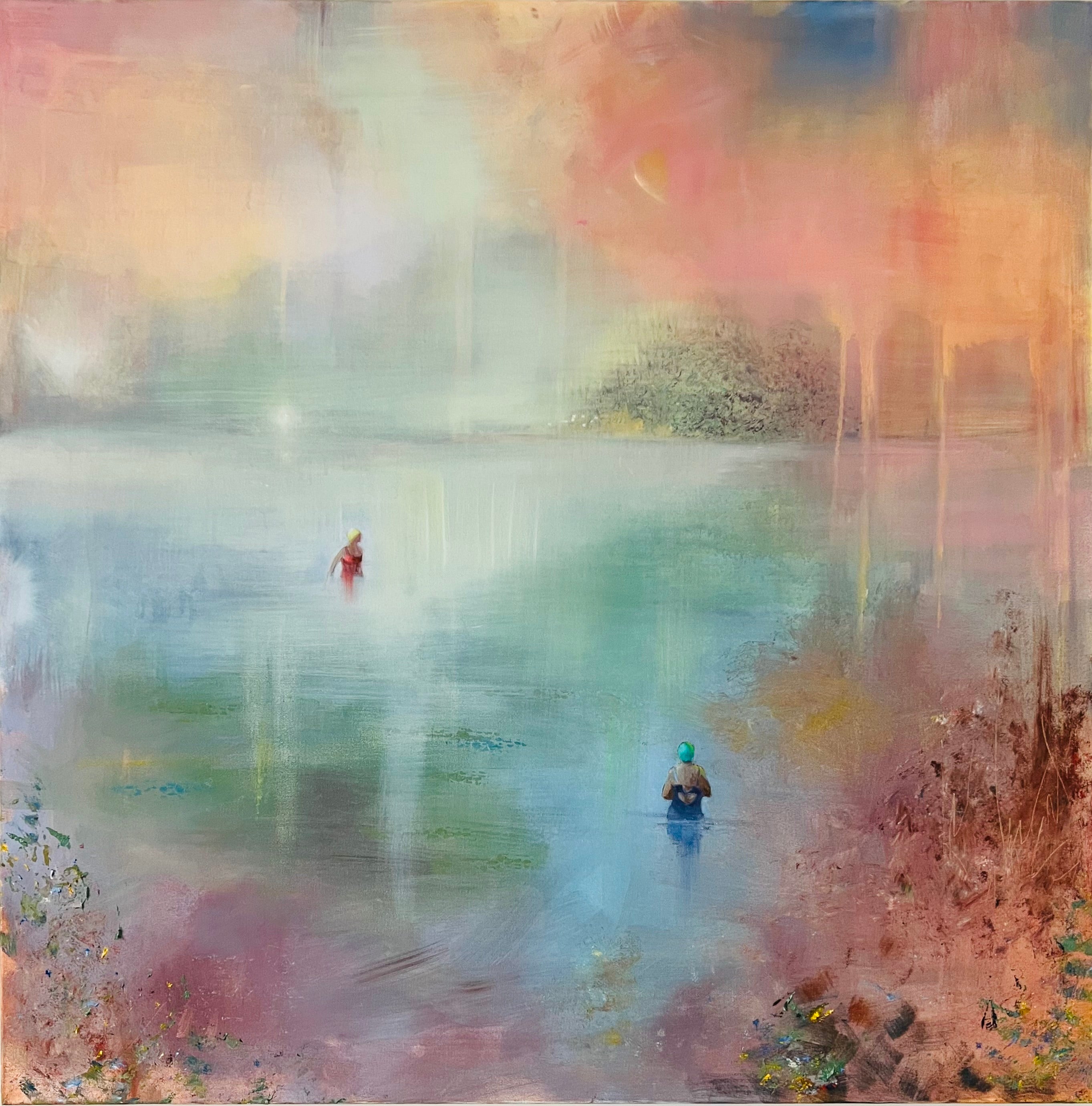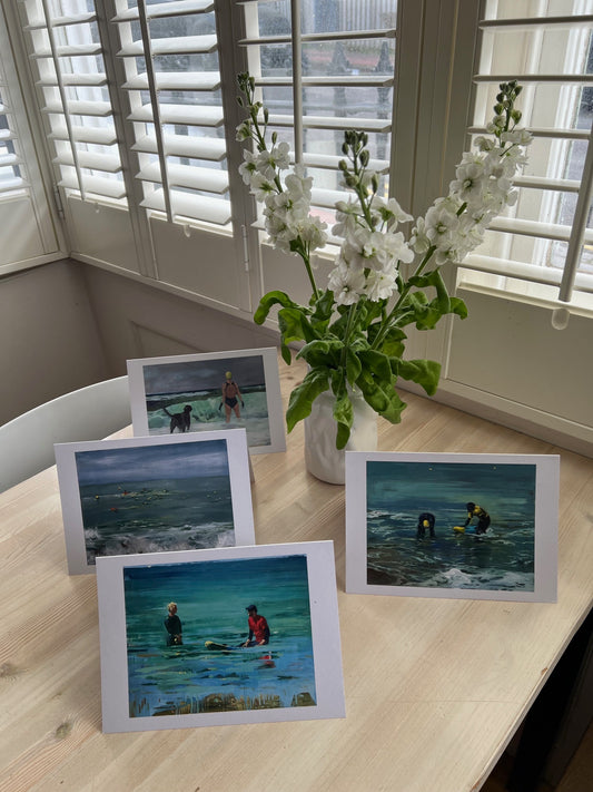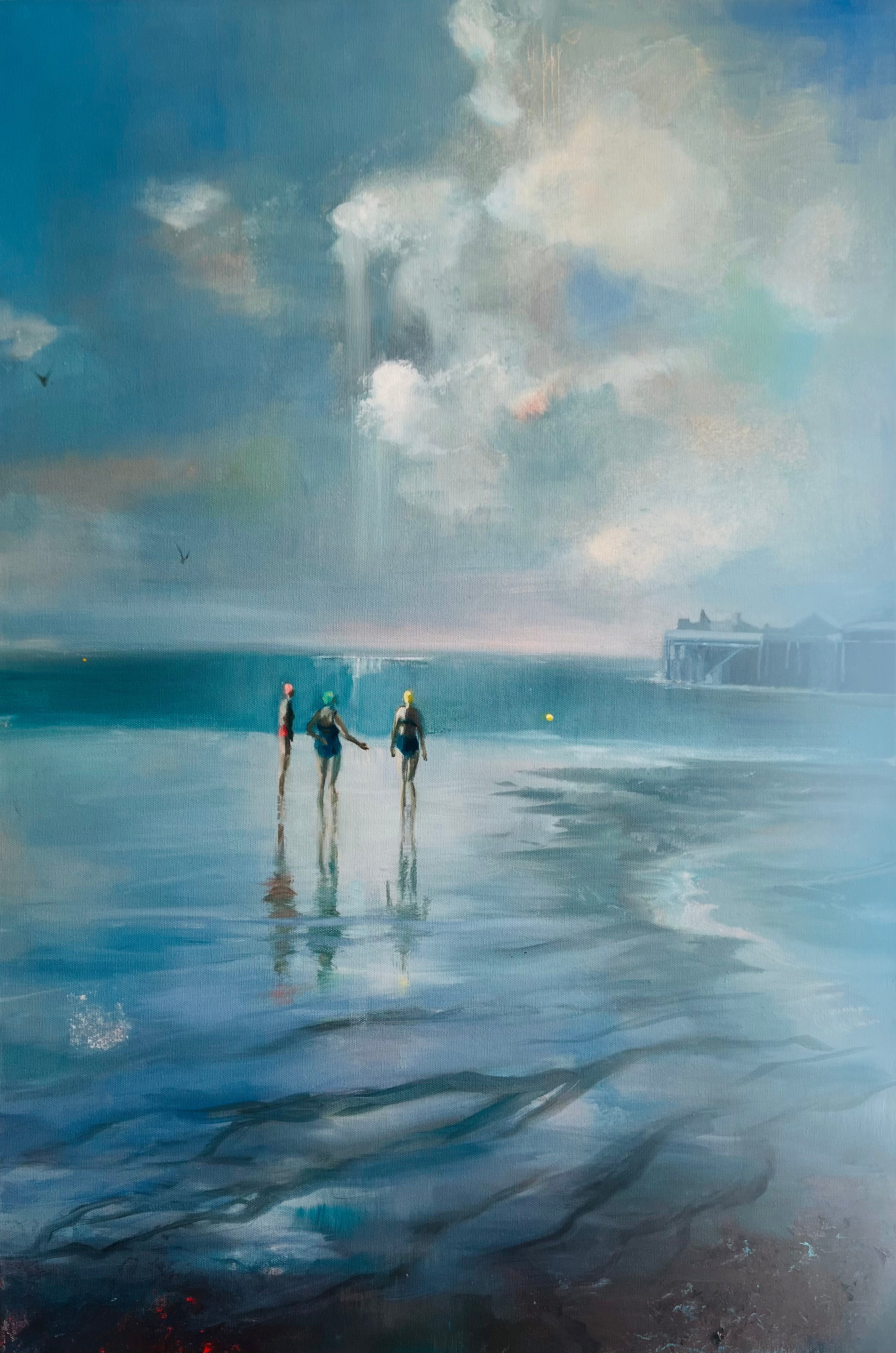 I swim, paint and live on the coast in Brighton UK. A year-round sea swimmer, member of Brighton Swimming Club and Sealanes on the front, I live in a perfect place to witness and record the open sky and sea, the unique experience of swimming with others. Painting in oils, on linen or canvas, I try to express how it feels to experience our connection with the sea, the sky and each other.