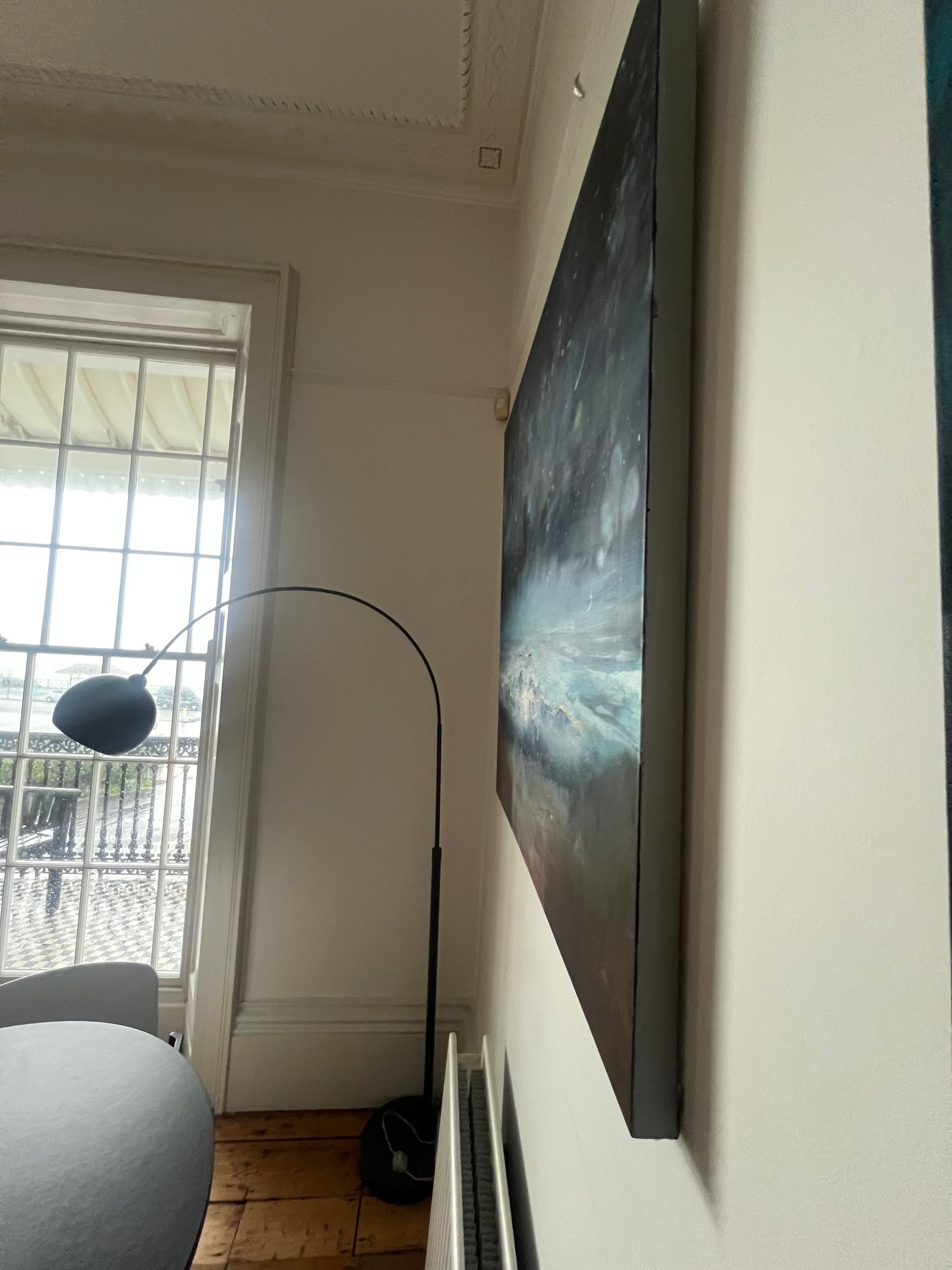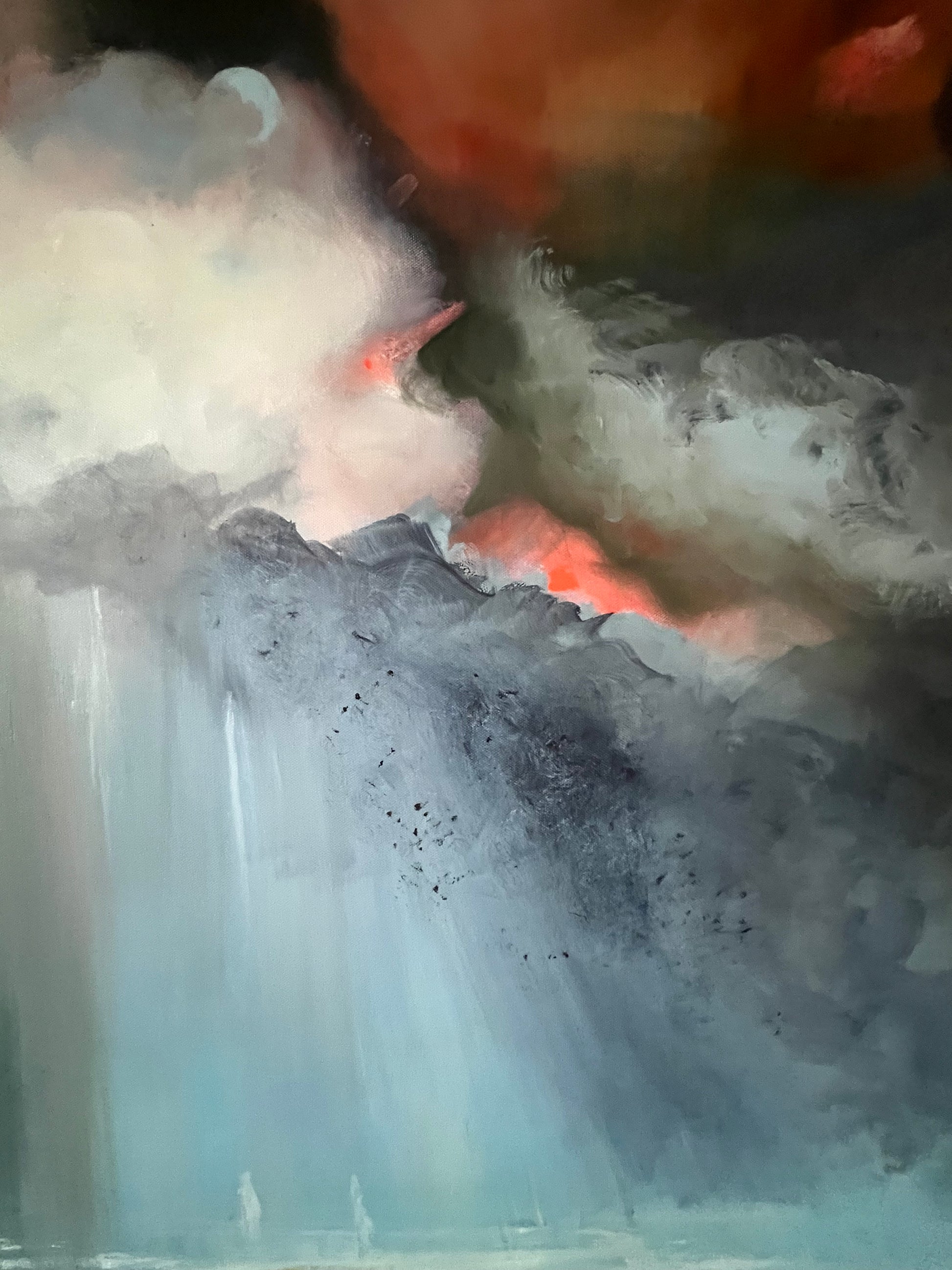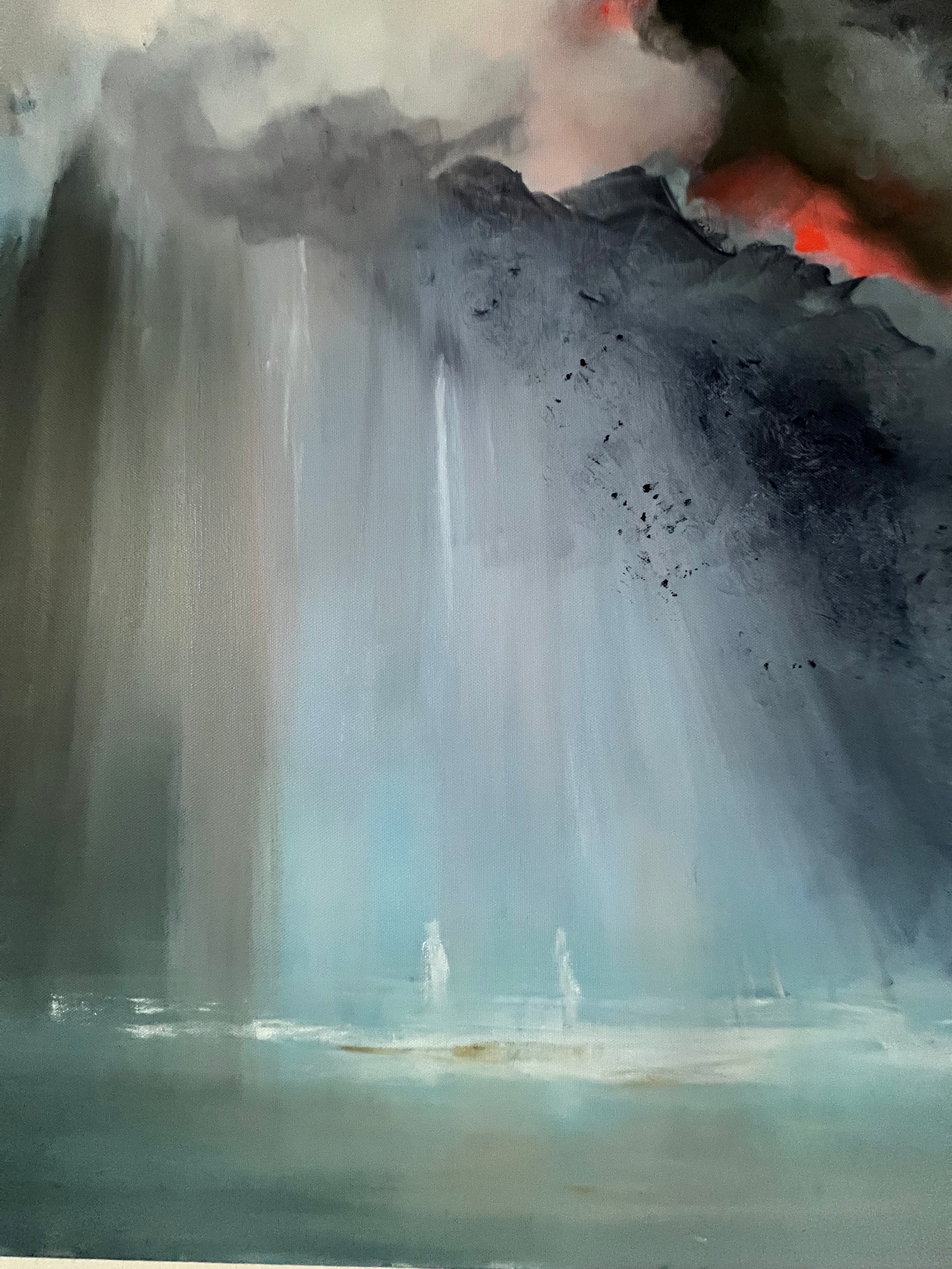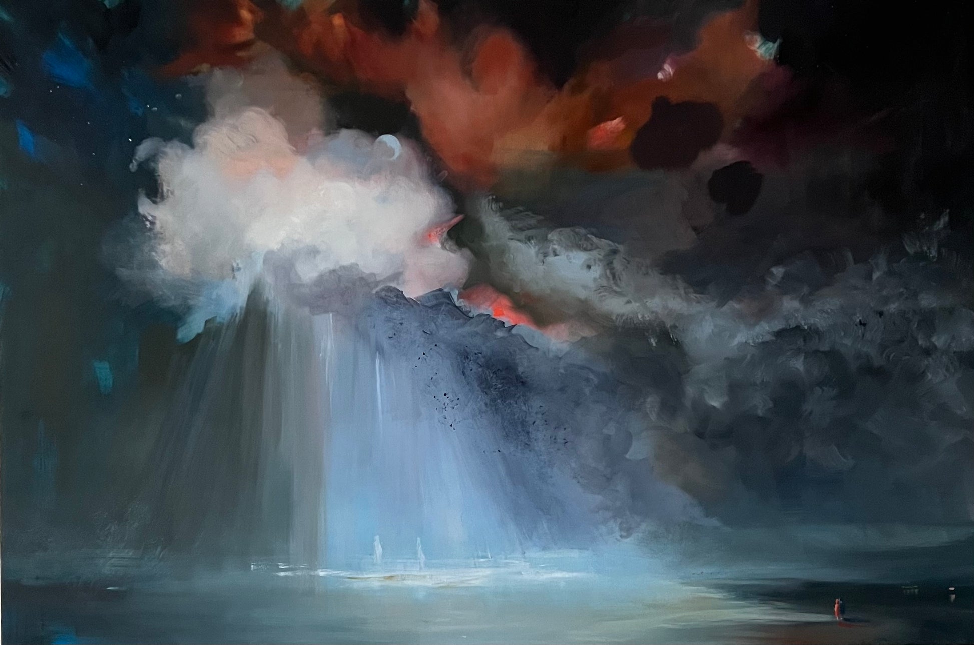 During winter storms the power of the sea and sky dominate our rooms. I aim to represent that energy in these large, atmospheric pieces, the people on the beach tiny, what could be spirits in the light between the sky and the sea.