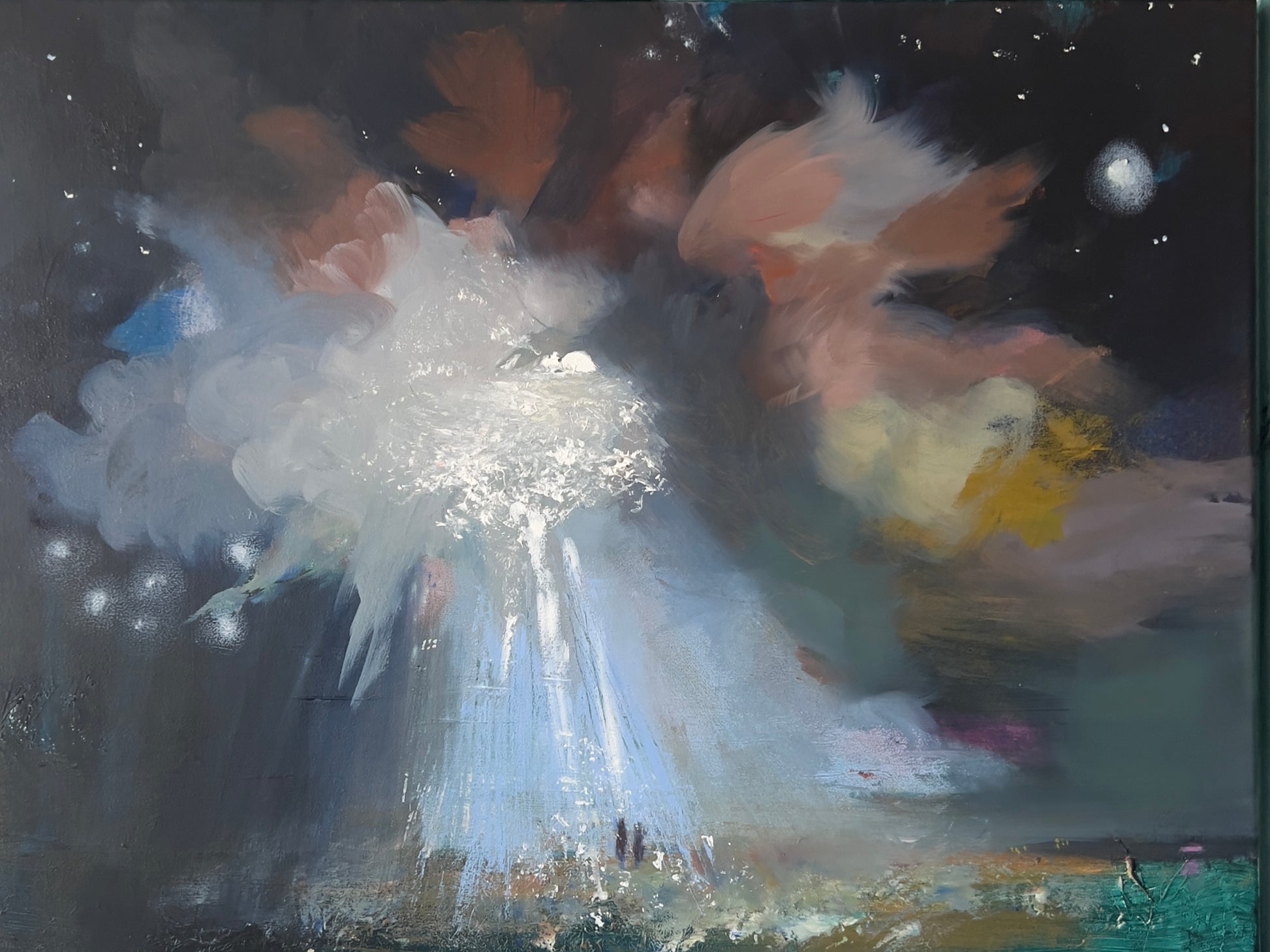 I painted this framed piece alongside the much larger painting, spirit in the sky. Just to experiment whether this could work on a smaller scale. The result is I think more intense as so much going on - real feeling of compressed energy.